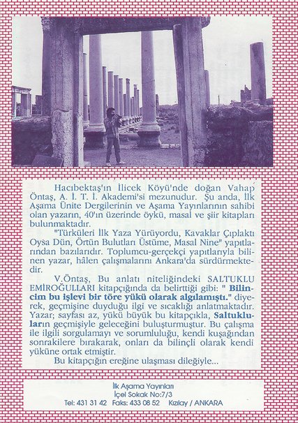 Ben Bilge Saltuk / Aysaltuk’un “tek evlaldı” / yol / kalem yoldaşı Tigin Orçun boy / budun / Konat Ata’larım gibi töremi / yasa’mı bildim Anadilim’i / Türkçe’mi yurdum / toprağım belledim susanlardan / susturulanlardan / savrulanlardan olmadım Öz’üm Su’dan / Işık’tandır Konat’ım / Halk’ım Yücelsin / Bilinir Olsun. …