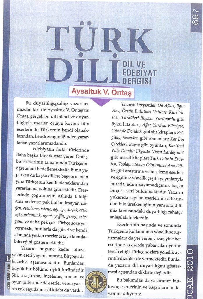 Türk Dili ve Edebiyat Dergisi’nin OCAK 2010 sayısında Aysaltuk V. Öntaş ile ilgili değerlendirme yazısında aşağıdaki tanımlamalarla yazarın Türkçe birikimi anlatılmıştır.